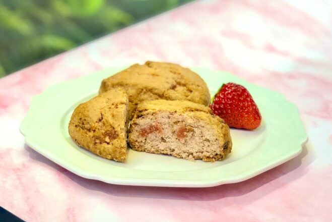 自家製いちごジャム入りのサクふわ食感のスコーンに プラントベースホイップと