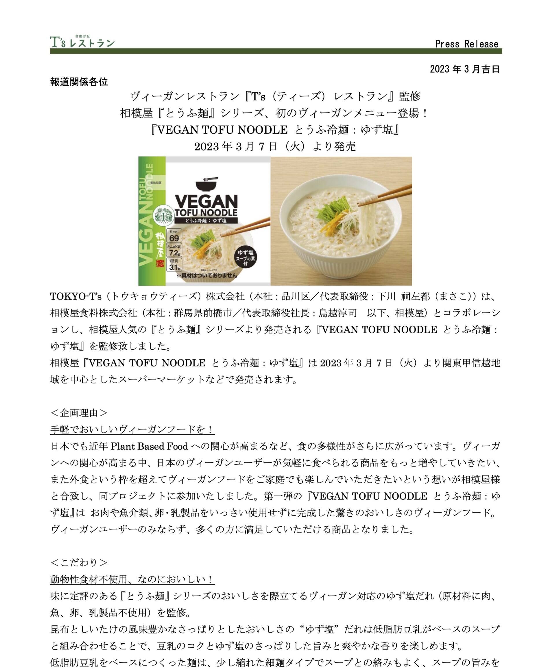 T’sレストランと相模屋さんがコラボレーションさせていただいた商品が発売されます。この度、人気の『とうふ麺』シリーズ『VEGAN TOFU NOODLE とうふ冷麺:ゆず塩』を監修致しました!
